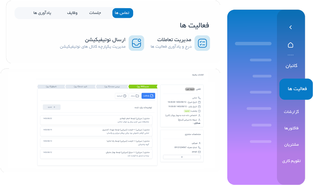ماژول فعالیتها در الف CRM مرکز مدیریت تعاملات روزانه شما با مشتریان و تیم است.