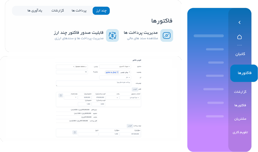 ماژول مدیریت فاکتورها در الف CRM امکان ثبت و مدیریت فاکتورها با ارزهای مختلف را به خصوص برای کسبوکارهای بینالمللی به سادگی فراهم میکند.