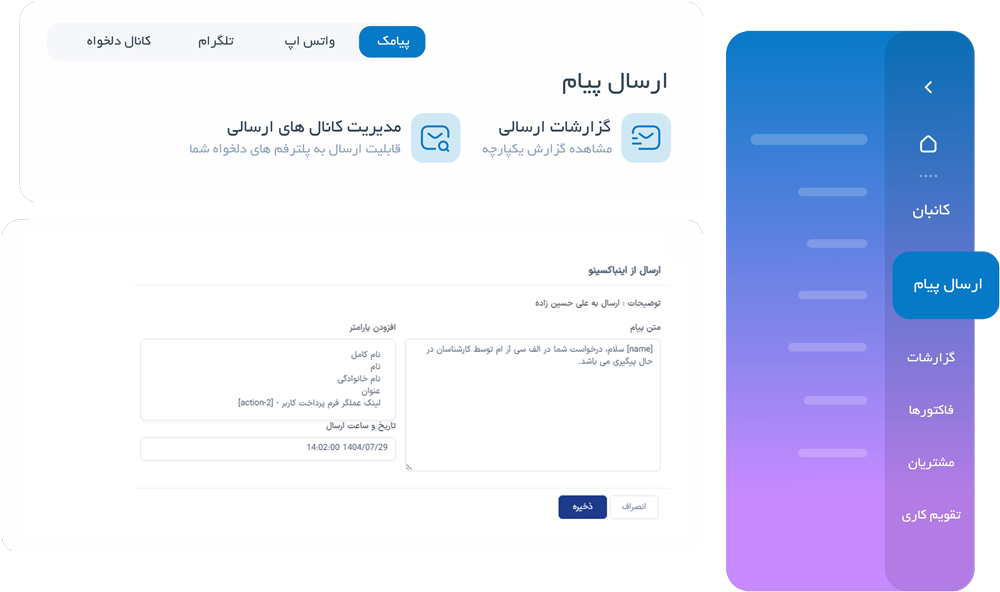 - پشتیبانی از کانالهای متنوع: پیامک، ایمیل، واتساپ، تلگرام و پیامرسانهای داخلی.