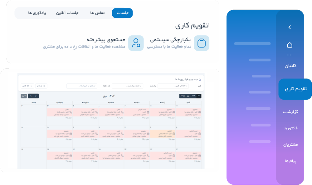 جلسات، وظایف و یادآوری‌ها به‌صورت روزانه، هفتگی یا ماهانه.